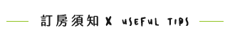 | • | 《入住時間》當日下午15:00 後皆可入住;須事先與旅宿預約入住時間,請於入住1日前預約。 |